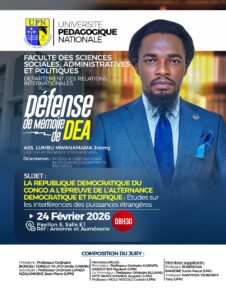 L’Assistant Jimmy Lumbu défend, ce mardi 24 février 2026, à l’Université Pédagogique Nationale (UPN), son mémoire de DEA intitulé : «La République Démocratique du Congo à l’épreuve de l’alternance démocratique et pacifique : Études sur les interférences des puissances étrangères».